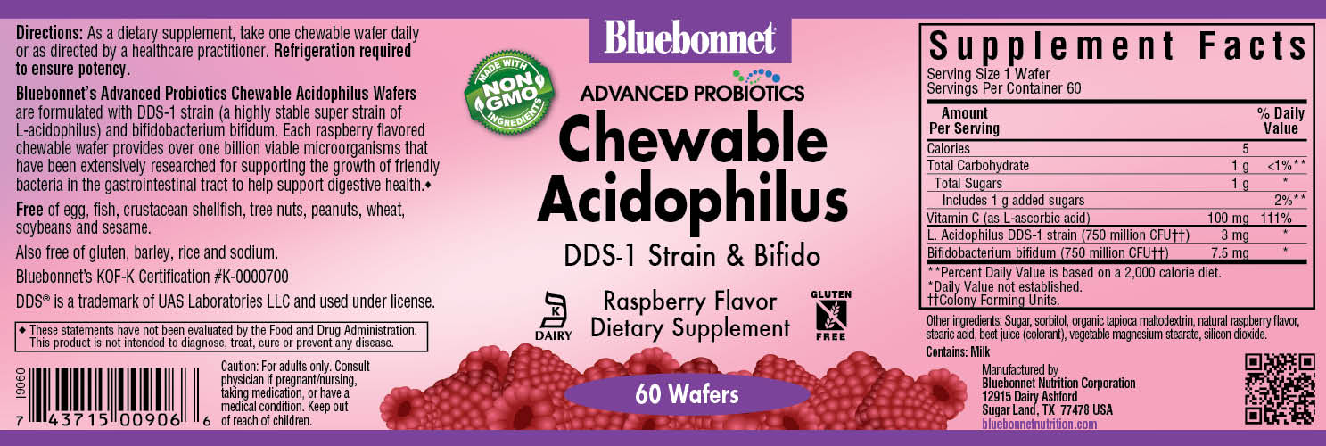 Bluebonnet’s Advanced Probiotics Chewable Acidophilus Wafers are formulated with DDS-1 strain (a highly stable super strain of L-acidophilus) and bifidobacterium bifidum. Each raspberry flavored chewable wafer provides over one billion viable microorganisms that have been extensively researched for supporting the growth of friendly bacteria in the gastrointestinal tract to help support digestive health. ♦